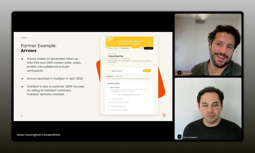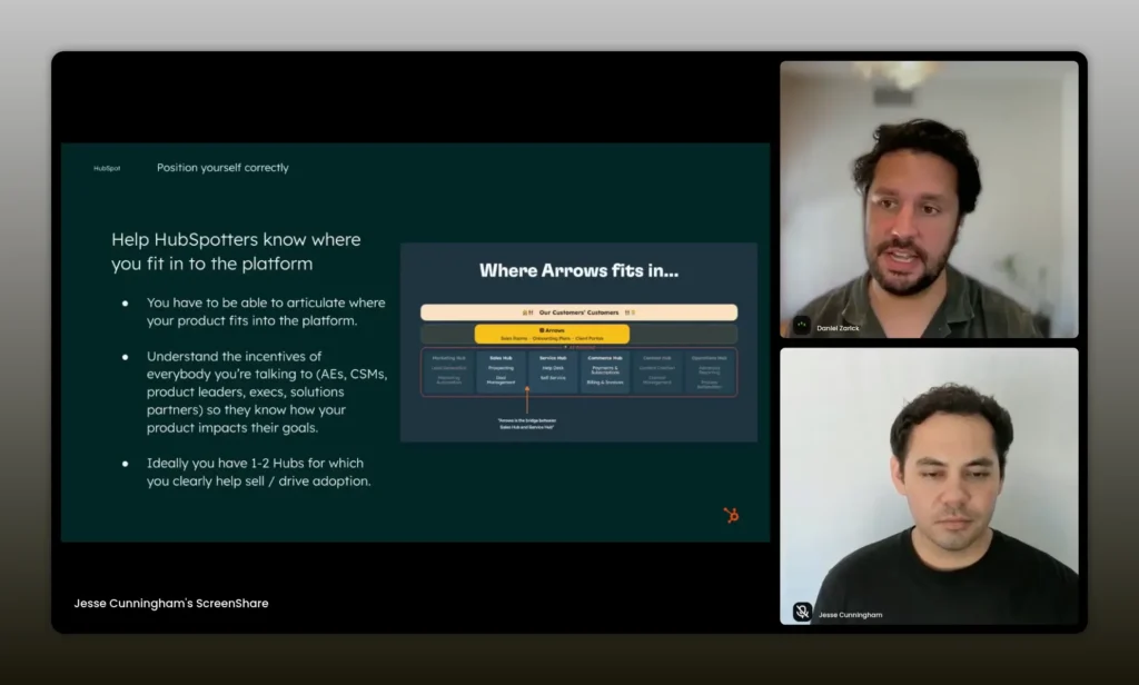 - Map your product positioning to the platform hubs: Arrows positioned itself between Sales Hub and Service Hub so both AEs and CSMs could see where Arrows fit in their playbooks.