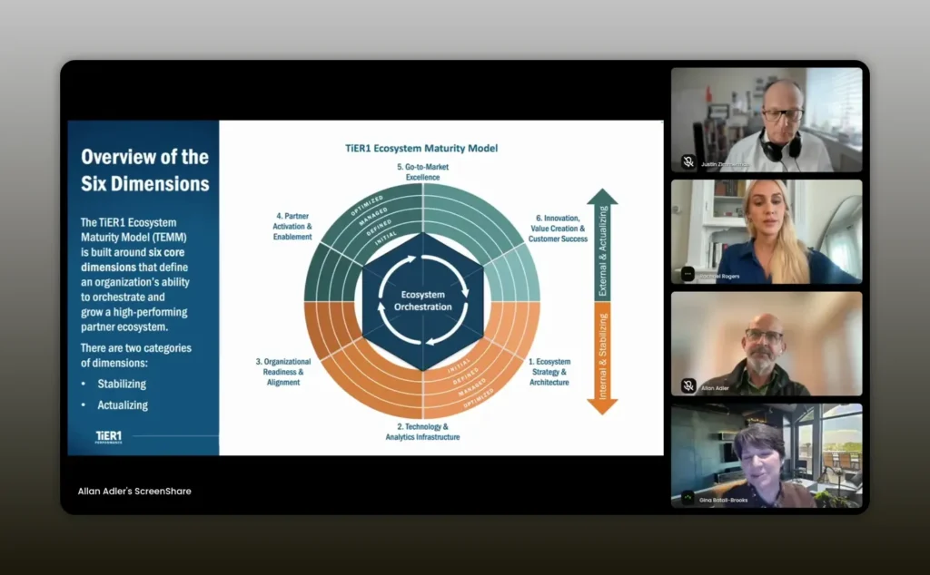 The Tier 1 maturity model groups capabilities into six dimensions across two broad zones: stabilizing and actualizing. Stabilizing dimensions form your foundation. Actualizing dimensions are where partner impact becomes visible and measurable.