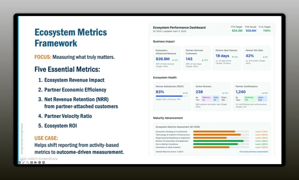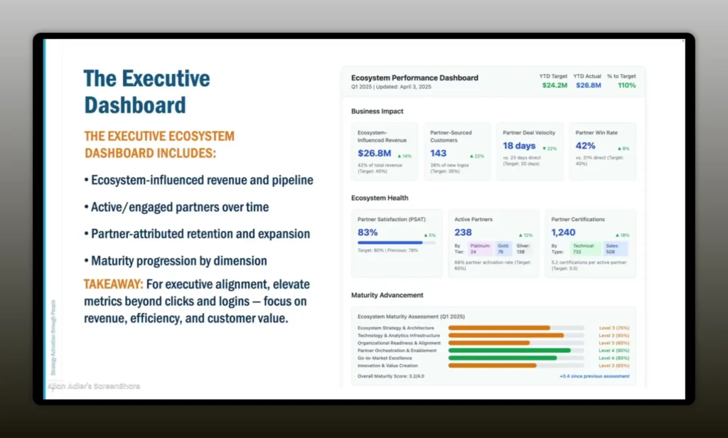 • Ecosystem revenue impact – What percentage of revenue is partner-influenced or partner-sourced?